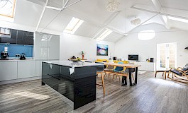 Entering the property on the first floor there is a spacious entrance hall which opens to a mezzanine study area and has access to a WC/Cloakroom which incorporates a utility cupboard with washer/dryer facilities. It then leads to a spectacular open plan kitchen/dining/living room which has vaulted ceilings, original ironwork, a circular feature window and French doors to a private terrace which has an artificial grass area. The kitchen has a range of high gloss units with Quartz worktops, an island unit and integrated appliances which includes an induction hob, two Bosch ovens, fridge/freezer, and dishwasher. On the ground floor there is a master bedroom which has fitted wardrobes and an ensuite shower room, two further double bedrooms with one having fitted wardrobes, and a well-appointed bathroom that has a white suite with a shower over the bath. The property further benefits from a private single garage, two allocated parking spaces, a storage unit, and use of the well-maintained communal gardens. SORRY NO PETS OR SMOKERS.