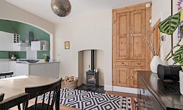 As you enter, you are greeted by a cosy lounge with some traditional features, large bay window and focal fireplace, creating an inviting atmosphere perfect for relaxation. The dining room, complete with a wood-burning stove, flows seamlessly into the modern kitchen, which boasts a striking vaulted ceiling with Velux, that enhances the sense of space and light. This open-plan layout is ideal for entertaining guests or enjoying family meals.